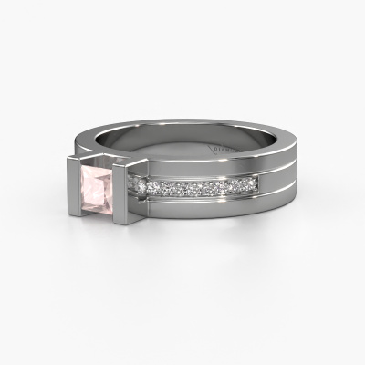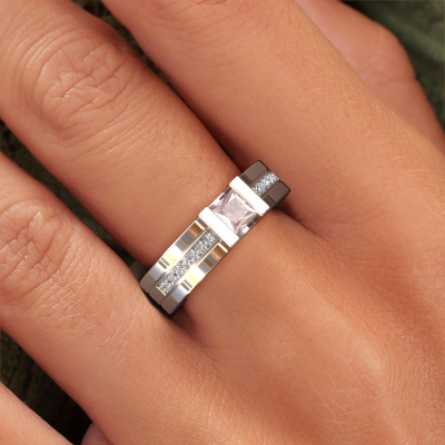 The ring shown above is called the Desire. We call this type of ring a pavé solitaire ring because it has one centre gemstone and a band that is also pave set with gemstones. The 14 Carat white gold engagement ring is set with a princess 4 mm morganite champagne centre stone and the band is pave set with diamond gemstones. Each jewel is made just for you by our master goldsmiths in our own studio.This modern white gold pavé solitaire engagement ring has an exquisite princess morganite champagne centre stone. To further accentuate the centre stone, the band is fully set with more diamonds. Its open prong setting allows light to strike the morganite champagne from various angles and this adds sparkle to your morganite champagne ring. The photo shown above depicts the goldsmith's carefully handcrafted details of the ring. The high positioning of the centre stone is truly eye-catching. The perfect engagement ring for the crown jewel of your life! By using a combination of the latest modern techniques, combined with ancient crafting, we can make all our engagement rings in our own studio. Each jewel is made to order. This is advantageous because we can offer you a price you won't find anywhere else.Have you found a specific engagement ring somewhere which you would like to give to your loved one? Please feel free to express your wishes to our jewel designers because we would be honoured to turn your design into a modern engagement ring. You can follow the development of your ring design because we use 3D drawings. This gives you a realistic preview of how your design will look. You can also preorder a dummy. A dummy is a plastic ring, which can be shaped according your ring design. You can try it on and check if its width and size are suitable for you. We will gladly send you a non-binding offer, based on a fair price/ quality ratio. It will amaze you, considering the quality of the ring and gemstones.To make it easier for you, we offer a 30 day return policy. Check our terms and conditions.