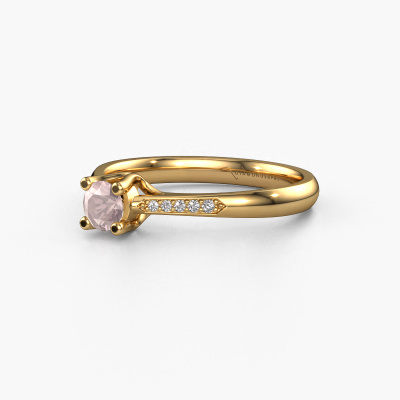 The ring shown above is called the Janna 2. We call this type of ring a pavé solitaire ring because it has one centre gemstone and a band that is also pave set with gemstones. This promise ring is made in 14 Carat gold set with a 4 mm round morganite champagne, and pave set diamonds at the sides. Each piece of jewellery is made just for you by our master goldsmiths in our own studio.This classic gold pavé solitaire promise ring has an exquisite round morganite champagne centre stone. To further accentuate the centre stone, the band is set full with more diamonds. Its open prong setting allows light to strike the morganite champagne from various angles and this adds sparkle to your morganite champagne ring. The photo shown above depicts the goldsmith's carefully handcrafted details of the ring. The high positioning of the centre stone is truly eye-catching. The perfect promise ring for the crown jewel of your life!By using a combination of the latest modern techniques, combined with ancient crafting, we can make all our promise ring in our own studio. Each jewel is made to order. This is advantageous because we can offer you a price you won't find anywhere else.Do you have a specific ring in mind? One you came across somewhere. Please feel free to tell us your wishes and we will turn your design into a unique promise ring. You can follow the development of your ring design because we use 3D drawings. This gives you a realistic preview of your design. We will gladly send you a non-binding offer, based on a fair price/ quality ratio. It will amaze you.To make it easier for you, we offer a 30 day return policy. Check our terms and conditions.