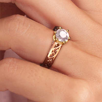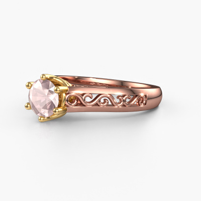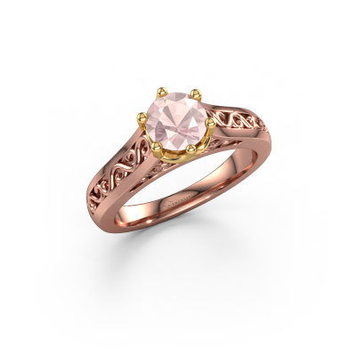 The ring shown above is called the Shan, we call this a solitaire ring because it contains a single gemstone. The engagement ring is made in 14 Carat rose gold and has a round morganite champagne of 6 mm. The cool thing about our configurator is that you can compile your own piece of jewellery, into a completely personalized one. This solitaire ring is crafted in the precious metals rose gold with gold, but of course you are free to pick your own colours. Each piece of jewellery is made by a team of passionate goldsmiths and jewel designers. This will make your crown jewel truly eye-catching.The solitaire ring is a special type of engagement ring. Its open prong setting allows light to strike the gemstone from various angles. This Celtic engagement ring is a stunning eye-catcher because of the high positioning of the gemstone. In order for you to commemorate your proposal with a unique ring, we carefully adorn this solitaire ring by hand. The love of your life deserves nothing but the best. By using our modern techniques, we can design and customize the finest quality jewels with the utmost care for you. Our engagement rings are always priced 30 percent lower than other jewellers. We make engagement rings to order so we don't have to maintain a large stock. If you have a certain budget, we are more than happy to advice you accordingly.Have you found a specific engagement ring somewhere which you would like to give to your loved one? Please feel free to express your wishes to our jewel designers because we would be honoured to turn your design into a Celtic engagement ring. You can follow the development of your ring design because we use 3D drawings. This gives you a realistic preview of how your design will look. You can also preorder a dummy. A dummy is a plastic ring, which can be shaped according your ring design. You can try it on and check if its width and size are suitable for you. We will gladly send you a non-binding offer, based on a fair price/ quality ratio. It will amaze you, considering the quality of the ring and gemstones.To make it easier for you, we offer a 30 day return policy. Check our terms and conditions.