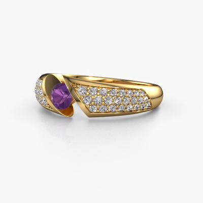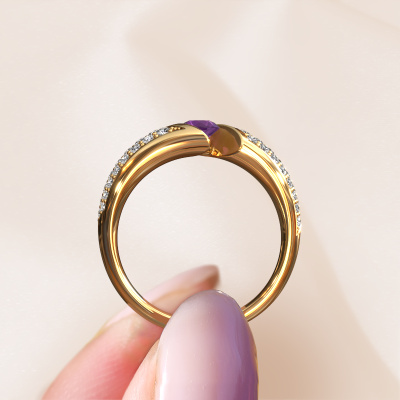 The ring shown above is called Hojalien 3. We call this a pave ring. The smaller gemstones of pave ring are set in a close row which gives it an extra shine. This 14 Carat gold ring is set with amethysten 4.2 mm. The ring shown above is called Hojalien 3. We call this a pave ring. The smaller gemstones of pave ring are set in a close row which gives it an extra shine. Which emotion would you like to convey when you get down on one knee for her? This gold engagement ring is pave set with stunning amethysten to represent your everlasting love. The gemstones are carefully hand selected and set by our goldsmith. The unique reflection of light on the ring can only be captured if the amethysten are set in a perfect line. During the crafting and polishing of the jewellery, light fall is constantly monitored, until the expert goldsmith is satisfied with the result. A ring designed just for you to make your loved one shine bright like a diamond. Because there is only one special person fit to wear such a unique ring! With this meaningful piece of art, the symbol of infinity, you will prove your undying love for her and that you want to share the rest of your life with no one else. How will she be able to resist? This piece of jewellery is made to shine bright around your finger. Each jewel is hand made with love by our goldsmiths.Are you on a budget? Please feel free to contact us, so we can go discuss your options. We offer our engagement rings at guaranteed best price, because we make them to order. You won't find such a price anywhere else!Our team adds new designs to our online collection daily. Our designers and goldsmiths work together in creating the best design. We strive to offer a diverse collection of jewels. Perhaps you have a specific jewel design in mind. One you came across somewhere. Please contact us for a free consultation. We will make you an offer, based on a fair price/ quality ratio, that will baffle you.To make it easier for you, we offer a 30 day return policy. Check our terms and conditions.