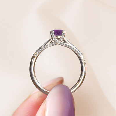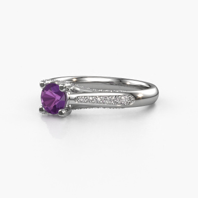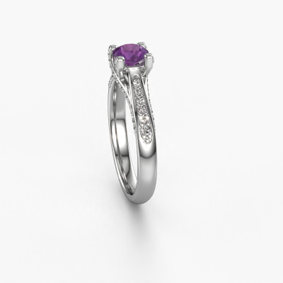 This platinum ring is called Mia 3 and is set with 5 mm amethyst. This exclusive platinum pavé solitaire engagement ring is a true work of art! The ornaments are crafted with a lot of patience and great passion. In order to create this ring with great precision, this craft requires a keen eye and skilful hand. A challenge which ignites a fire in our expert goldsmith. The exquisite amethysten are set in a special way so they stand out even more. This gives the ring an even more glamorous appearance. The shiny engagement ring is actually unique on its own because of the gemstones which we carefully select especially for this ring. On top of that you select the precious metals which will be used to create a unique ring for the most extraordinary woman in your life! This jewel is unique in every way! Simply customize to your likingAre you on a budget? Please feel free to contact us, so we can go discuss your options. We offer our engagement rings at guaranteed best price, because we make them to order. You won't find such a price anywhere else!Our team adds new designs to our online collection daily. Our designers and goldsmiths work together in creating the best design. We strive to offer a diverse collection of jewels. Perhaps you have a specific jewel design in mind. One you came across somewhere. Please contact us for a free consultation. We will make you an offer, based on a fair price/ quality ratio, that will baffle you.To make it easier for you, we offer a 30 day return policy. Check our terms and conditions.