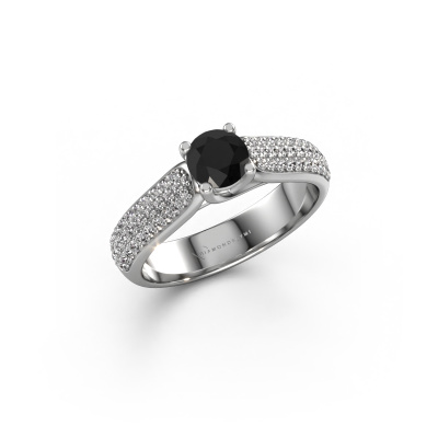 The ring shown above is called the Leoness. We call this type of ring a pavé solitaire ring. The centre gemstone is surrounded by smaller sized stones. This platinum version is set with a 0.60 crt round black diamond centre stone, embraced by smaller diamonds. What makes this classic platinum pavé solitaire ring special is the setting of the smaller gems surrounding the centre black diamond, which are shaped like a beautiful flower. The surrounding pavé solitaire of stones frame the middle centre stone in such a way to make it appear bigger. This type of engagement ring is also called a flower ring. It is very important that the smaller diamonds are positioned identically so there is no interference of light but perfect unity instead. Our skilled Goldsmiths get the job done. Each individual stone is carefully set by hand. During manufacturing, light fall is constantly monitored to make sure the special pavé solitaire effect is still visible. In the end you get the perfect engagement ring with a radiant black diamond gemstone centrepiece. You can imagine the effect of a ring of such significance when you give tot the love of your life on her special day to shine. This jewel is unique in every way! Simply customize to your liking,By using our modern techniques, we can design and customize the finest quality jewels with the utmost care for you. Our engagement rings are always priced 30 percent lower than other jewellers. We make engagement rings to order so we don't have to maintain a large stock. If you have a certain budget, we are more than happy to advice you accordingly.Have you found a specific engagement ring somewhere which you would like to give to your loved one? Please feel free to express your wishes to our jewel designers because we would be honoured to turn your design into a classic engagement ring. You can follow the development of your ring design because we use 3D drawings. This gives you a realistic preview of how your design will look. You can also preorder a dummy. A dummy is a plastic ring, which can be shaped according your ring design. You can try it on and check if its width and size are suitable for you. We will gladly send you a non-binding offer, based on a fair price/ quality ratio. It will amaze you, considering the quality of the ring and gemstones.To make it easier for you, we offer a 30 day return policy. Check our terms and conditions.
