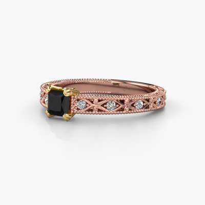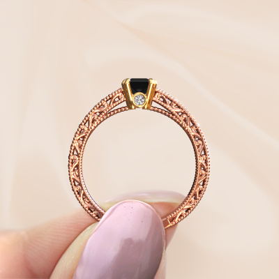 This 14 Carat rose gold ring is called Ardella and is set with 0.660 crt black diamond. An extraordinary rose gold vintage ring. One that will surely make the love of your life shine like a diamond! That is what we hope to achieve. This vintage engagement ring is set with exquisite black diamond. Whichever gemstone you choose from our selection, is up to you. The gemstone is selected with great care because we believe your filigree engagement ring must be adorned with nothing but the most beautiful gemstone. Wouldn't you agree? Our expert goldsmith will design your ring in our own crafting studio, where the black diamond will be set with great precision. The ring will then be polished till it shines perfectly. Nothing but the best for the love of your life! This jewel is made just for you by our master goldsmiths in our own studio.After receiving your order, our goldsmiths will passionately start the creative process of making your engagement ring in our own studio. Because we don't have a big stockpile, these costs will not be passed on to you. Our pricing is proof of that! We offer top quality jewels at lowest price, guaranteed.Different styles of new rings are made daily by our team. Perhaps you have found a pavé solitaire engagement ring somewhere. One you would like to give to your loved one. Please feel free to share your thoughts and design with our jewel designers. We would love to turn your design into a vintage engagement ring. You can follow the development of your ring design because we use very detailed 3D drawings. On top of that, you can order a dummy of the design. A dummy is a plastic ring, which can be shaped according your ring design. You can try it on and check if the engagement ring is up to standard. We will gladly send you a non-binding offer, based on a fair price/ quality ratio. The offer will baffle you, considering the quality of the ring and gemstones.To make it easier for you, we offer a 30 day return policy. Check our terms and conditions.