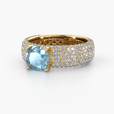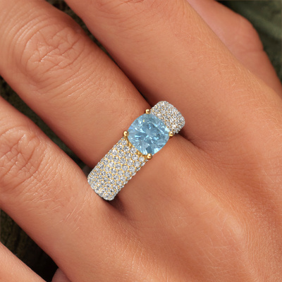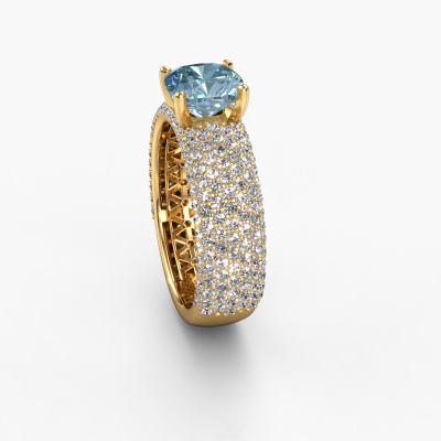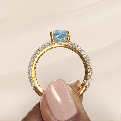 This 14 Carat gold ring is called Darcy and is set with 7 mm blue lab grown diamond. This exclusive gold pavé solitaire Engagement ring is a true work of art! The ornaments are crafted with a lot of patience and great passion. In order to create this ring with great precision, this craft requires a keen eye and skilful hand. A challenge which ignites a fire in our expert goldsmith. The exquisite blue lab grown diamonds are set in a special way so they stand out even more. This gives the ring an even more glamorous appearance. The pavé Engagement ring is actually unique on its own because of the gemstones which we carefully select especially for this ring. On top of that you select the precious metals which will be used to create a unique ring for the most extraordinary woman in your life! This jewel is unique in every way! Simply customize to your likingBecause we design and deliver our own rings, we can offer you a Engagement ring at a price you won't find anywhere else. A ring is made to order, which helps prevent excess supplies, so we can make you a great price offer. We understand it feels risky, buying your Engagement ring online, but we will gladly assist in the designing process, taking your budget into consideration.Different styles of new rings are made daily by our team. Perhaps you have found a pavé solitaire Engagement ring somewhere. One you would like to give to your loved one. Please feel free to share your thoughts and design with our jewel designers. We would love to turn your design into a exclusive Engagement ring. You can follow the development of your ring design because we use very detailed 3D drawings. On top of that, you can order a dummy of the design. A dummy is a plastic ring, which can be shaped according your ring design. You can try it on and check if the Engagement ring is up to standard. We will gladly send you a non-binding offer, based on a fair price/ quality ratio. The offer will baffle you, considering the quality of the ring and gemstones.To make it easier for you, we offer a 30 day return policy. Check our terms and conditions.