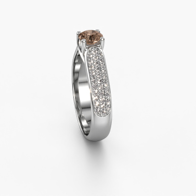 The ring shown above is called the Leoness. We call this type of ring a pavé solitaire ring. The centre gemstone is surrounded by smaller sized stones. This platinum version is set with a 0.50 crt round brown diamond centre stone, embraced by smaller diamonds. What makes this classic platinum pavé solitaire ring special is the setting of the smaller gems surrounding the centre brown diamond, which are shaped like a beautiful flower. The surrounding pavé solitaire of stones frame the middle centre stone in such a way to make it appear bigger. This type of engagement ring is also called a flower ring. It is very important that the smaller diamonds are positioned identically so there is no interference of light but perfect unity instead. Our skilled Goldsmiths get the job done. Each individual stone is carefully set by hand. During manufacturing, light fall is constantly monitored to make sure the special pavé solitaire effect is still visible. In the end you get the perfect engagement ring with a radiant brown diamond gemstone centrepiece. You can imagine the effect of a ring of such significance when you give tot the love of your life on her special day to shine. This jewel is unique in every way! Simply customize to your liking,By using our modern techniques, we can design and customize the finest quality jewels with the utmost care for you. Our engagement rings are always priced 30 percent lower than other jewellers. We make engagement rings to order so we don't have to maintain a large stock. If you have a certain budget, we are more than happy to advice you accordingly.Have you found a specific engagement ring somewhere which you would like to give to your loved one? Please feel free to express your wishes to our jewel designers because we would be honoured to turn your design into a classic engagement ring. You can follow the development of your ring design because we use 3D drawings. This gives you a realistic preview of how your design will look. You can also preorder a dummy. A dummy is a plastic ring, which can be shaped according your ring design. You can try it on and check if its width and size are suitable for you. We will gladly send you a non-binding offer, based on a fair price/ quality ratio. It will amaze you, considering the quality of the ring and gemstones.To make it easier for you, we offer a 30 day return policy. Check our terms and conditions.