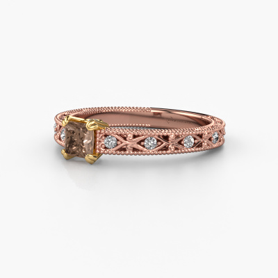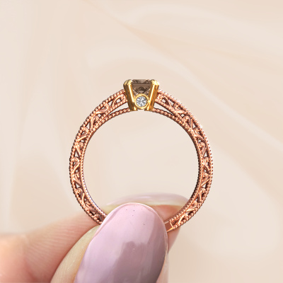 This 14 Carat rose gold ring is called Ardella and is set with 0.58 crt brown diamond. An extraordinary rose gold vintage ring. One that will surely make the love of your life shine like a diamond! That is what we hope to achieve. This vintage engagement ring is set with exquisite brown diamond. Whichever gemstone you choose from our selection, is up to you. The gemstone is selected with great care because we believe your filigree engagement ring must be adorned with nothing but the most beautiful gemstone. Wouldn't you agree? Our expert goldsmith will design your ring in our own crafting studio, where the brown diamond will be set with great precision. The ring will then be polished till it shines perfectly. Nothing but the best for the love of your life! This jewel is made just for you by our master goldsmiths in our own studio.After receiving your order, our goldsmiths will passionately start the creative process of making your engagement ring in our own studio. Because we don't have a big stockpile, these costs will not be passed on to you. Our pricing is proof of that! We offer top quality jewels at lowest price, guaranteed.Different styles of new rings are made daily by our team. Perhaps you have found a pavé solitaire engagement ring somewhere. One you would like to give to your loved one. Please feel free to share your thoughts and design with our jewel designers. We would love to turn your design into a vintage engagement ring. You can follow the development of your ring design because we use very detailed 3D drawings. On top of that, you can order a dummy of the design. A dummy is a plastic ring, which can be shaped according your ring design. You can try it on and check if the engagement ring is up to standard. We will gladly send you a non-binding offer, based on a fair price/ quality ratio. The offer will baffle you, considering the quality of the ring and gemstones.To make it easier for you, we offer a 30 day return policy. Check our terms and conditions.