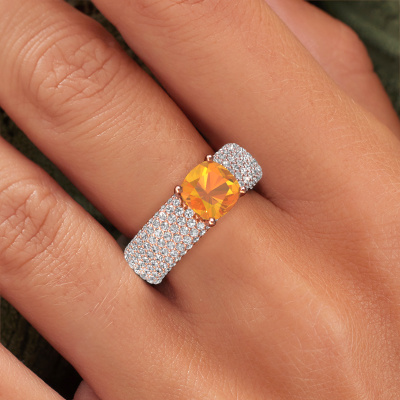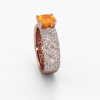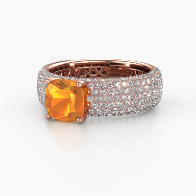 This 14 Carat rose gold ring is called Darcy and is set with 7 mm citrin. This exclusive rose gold pavé solitaire Engagement ring is a true work of art! The ornaments are crafted with a lot of patience and great passion. In order to create this ring with great precision, this craft requires a keen eye and skilful hand. A challenge which ignites a fire in our expert goldsmith. The exquisite citrin are set in a special way so they stand out even more. This gives the ring an even more glamorous appearance. The pavé Engagement ring is actually unique on its own because of the gemstones which we carefully select especially for this ring. On top of that you select the precious metals which will be used to create a unique ring for the most extraordinary woman in your life! This jewel is unique in every way! Simply customize to your likingBecause we design and deliver our own rings, we can offer you a Engagement ring at a price you won't find anywhere else. A ring is made to order, which helps prevent excess supplies, so we can make you a great price offer. We understand it feels risky, buying your Engagement ring online, but we will gladly assist in the designing process, taking your budget into consideration.Different styles of new rings are made daily by our team. Perhaps you have found a pavé solitaire Engagement ring somewhere. One you would like to give to your loved one. Please feel free to share your thoughts and design with our jewel designers. We would love to turn your design into a exclusive Engagement ring. You can follow the development of your ring design because we use very detailed 3D drawings. On top of that, you can order a dummy of the design. A dummy is a plastic ring, which can be shaped according your ring design. You can try it on and check if the Engagement ring is up to standard. We will gladly send you a non-binding offer, based on a fair price/ quality ratio. The offer will baffle you, considering the quality of the ring and gemstones.To make it easier for you, we offer a 30 day return policy. Check our terms and conditions.