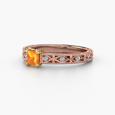 This 14 Carat rose gold ring is called Ardella and is set with 4 mm citrin. An extraordinary rose gold vintage ring. One that will surely make the love of your life shine like a diamond! That is what we hope to achieve. This vintage engagement ring is set with exquisite citrin. Whichever gemstone you choose from our selection, is up to you. The gemstone is selected with great care because we believe your filigree engagement ring must be adorned with nothing but the most beautiful gemstone. Wouldn't you agree? Our expert goldsmith will design your ring in our own crafting studio, where the citrin will be set with great precision. The ring will then be polished till it shines perfectly. Nothing but the best for the love of your life! This jewel is made just for you by our master goldsmiths in our own studio.After receiving your order, our goldsmiths will passionately start the creative process of making your engagement ring in our own studio. Because we don't have a big stockpile, these costs will not be passed on to you. Our pricing is proof of that! We offer top quality jewels at lowest price, guaranteed.Different styles of new rings are made daily by our team. Perhaps you have found a pavé solitaire engagement ring somewhere. One you would like to give to your loved one. Please feel free to share your thoughts and design with our jewel designers. We would love to turn your design into a vintage engagement ring. You can follow the development of your ring design because we use very detailed 3D drawings. On top of that, you can order a dummy of the design. A dummy is a plastic ring, which can be shaped according your ring design. You can try it on and check if the engagement ring is up to standard. We will gladly send you a non-binding offer, based on a fair price/ quality ratio. The offer will baffle you, considering the quality of the ring and gemstones.To make it easier for you, we offer a 30 day return policy. Check our terms and conditions.