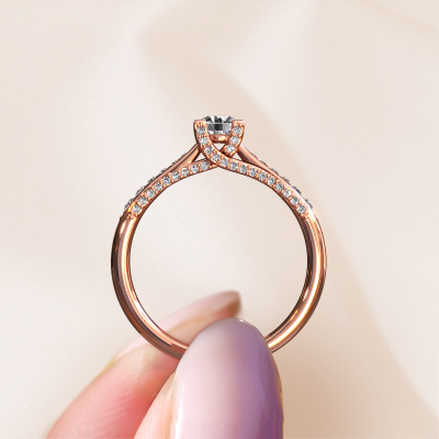 This 14 Carat rose gold ring is called Mia 3 and is set with 0.548 crt diamond. This exclusive rose gold pavé solitaire engagement ring is a true work of art! The ornaments are crafted with a lot of patience and great passion. In order to create this ring with great precision, this craft requires a keen eye and skilful hand. A challenge which ignites a fire in our expert goldsmith. The exquisite diamonds are set in a special way so they stand out even more. This gives the ring an even more glamorous appearance. The shiny engagement ring is actually unique on its own because of the gemstones which we carefully select especially for this ring. On top of that you select the precious metals which will be used to create a unique ring for the most extraordinary woman in your life! This jewel is unique in every way! Simply customize to your likingAre you on a budget? Please feel free to contact us, so we can go discuss your options. We offer our engagement rings at guaranteed best price, because we make them to order. You won't find such a price anywhere else!Our team adds new designs to our online collection daily. Our designers and goldsmiths work together in creating the best design. We strive to offer a diverse collection of jewels. Perhaps you have a specific jewel design in mind. One you came across somewhere. Please contact us for a free consultation. We will make you an offer, based on a fair price/ quality ratio, that will baffle you.To make it easier for you, we offer a 30 day return policy. Check our terms and conditions.