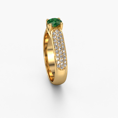 The ring shown above is called the Leoness. We call this type of ring a pavé solitaire ring. The centre gemstone is surrounded by smaller sized stones. This 14 Carat gold version is set with a 5 mm round emerald centre stone, embraced by smaller diamonds. What makes this classic gold pavé solitaire ring special is the setting of the smaller gems surrounding the centre emerald, which are shaped like a beautiful flower. The surrounding pavé solitaire of stones frame the middle centre stone in such a way to make it appear bigger. This type of engagement ring is also called a flower ring. It is very important that the smaller diamonds are positioned identically so there is no interference of light but perfect unity instead. Our skilled Goldsmiths get the job done. Each individual stone is carefully set by hand. During manufacturing, light fall is constantly monitored to make sure the special pavé solitaire effect is still visible. In the end you get the perfect engagement ring with a radiant emerald gemstone centrepiece. You can imagine the effect of a ring of such significance when you give tot the love of your life on her special day to shine. This jewel is unique in every way! Simply customize to your liking,By using our modern techniques, we can design and customize the finest quality jewels with the utmost care for you. Our engagement rings are always priced 30 percent lower than other jewellers. We make engagement rings to order so we don't have to maintain a large stock. If you have a certain budget, we are more than happy to advice you accordingly.Have you found a specific engagement ring somewhere which you would like to give to your loved one? Please feel free to express your wishes to our jewel designers because we would be honoured to turn your design into a classic engagement ring. You can follow the development of your ring design because we use 3D drawings. This gives you a realistic preview of how your design will look. You can also preorder a dummy. A dummy is a plastic ring, which can be shaped according your ring design. You can try it on and check if its width and size are suitable for you. We will gladly send you a non-binding offer, based on a fair price/ quality ratio. It will amaze you, considering the quality of the ring and gemstones.To make it easier for you, we offer a 30 day return policy. Check our terms and conditions.