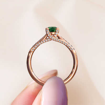 This 14 Carat rose gold ring is called Mia 3 and is set with 5 mm emerald. This exclusive rose gold pavé solitaire engagement ring is a true work of art! The ornaments are crafted with a lot of patience and great passion. In order to create this ring with great precision, this craft requires a keen eye and skilful hand. A challenge which ignites a fire in our expert goldsmith. The exquisite emerald are set in a special way so they stand out even more. This gives the ring an even more glamorous appearance. The shiny engagement ring is actually unique on its own because of the gemstones which we carefully select especially for this ring. On top of that you select the precious metals which will be used to create a unique ring for the most extraordinary woman in your life! This jewel is unique in every way! Simply customize to your likingAre you on a budget? Please feel free to contact us, so we can go discuss your options. We offer our engagement rings at guaranteed best price, because we make them to order. You won't find such a price anywhere else!Our team adds new designs to our online collection daily. Our designers and goldsmiths work together in creating the best design. We strive to offer a diverse collection of jewels. Perhaps you have a specific jewel design in mind. One you came across somewhere. Please contact us for a free consultation. We will make you an offer, based on a fair price/ quality ratio, that will baffle you.To make it easier for you, we offer a 30 day return policy. Check our terms and conditions.