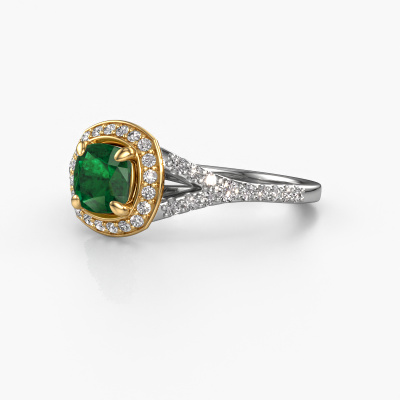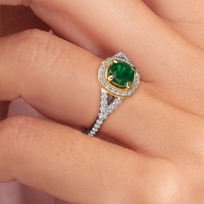 The ring shown above is called the Pamela CUS. We call this type of ring a halo ring because it has one centre gemstone and a band that is also pave set with gemstones. The 14 Carat white gold engagement ring is set with a cushion 5.5 mm emerald centre stone and the band is pave set with lab-grown diamonds. What makes this luxury white gold pavé solitaire ring special are the smaller sized stones embracing the centre stone. This gorgeous engagement ring is called a pavé solitaire ring because the smaller gemstones give the centre stone a pavé solitaire of surrounding light. In order for the smaller stones to enhance the centre stone, they have to be placed so there is no interference of light. And that's when our expert goldsmiths come in. Each individual stone is carefully set in the ring by hand. During manufacturing, light fall is constantly monitored to make sure the special pavé solitaire is still visible. In the end you get a unique engagement ring, with a emerald of your choosing at its centre. You can imagine the effect of a ring of such significance when you give it to her on her special day to shine. After receiving your order, our goldsmiths will passionately start the creative process of making your engagement ring in our own studio. Because we don't have a big stockpile, these costs will not be passed on to you. Our pricing is proof of that! We offer top quality jewels at lowest price, guaranteed.Different styles of new rings are made daily by our team. Perhaps you have found a pavé solitaire engagement ring somewhere. One you would like to give to your loved one. Please feel free to share your thoughts and design with our jewel designers. We would love to turn your design into a luxury engagement ring. You can follow the development of your ring design because we use very detailed 3D drawings. On top of that, you can order a dummy of the design. A dummy is a plastic ring, which can be shaped according your ring design. You can try it on and check if the engagement ring is up to standard. We will gladly send you a non-binding offer, based on a fair price/ quality ratio. The offer will baffle you, considering the quality of the ring and gemstones.To make it easier for you, we offer a 30 day return policy. Check our terms and conditions.