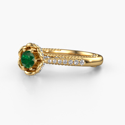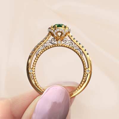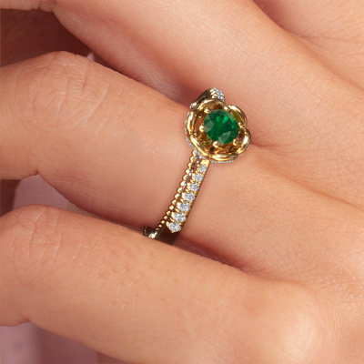 This 14 Carat gold ring is called Abbey and is set with 4.2 mm emerald. Is your girlfriend hooked on vintage? Then this gold pearl edges engagement ring will surely match her style perfectly. A trendy ring with just a hint of vintage adornment. A truly stunning, romantic design! Especially when you customize your ring to your own liking. This vintage pavé solitaire engagement ring is set with stunning emerald. As you can see, you are the boss in selecting a gemstone which matches the style of your girlfriend best. Each gemstone is carefully selected by our merchants whom are spread throughout the world. Nothing but the best gems for our expert goldsmith. After all, it is his crowning glory! Each jewel is made just for you, with attention to detail and design.By using our modern techniques, we can design and customize the finest quality jewels with the utmost care for you. Our engagement rings are always priced 30 percent lower than other jewellers. We make engagement rings to order so we don't have to maintain a large stock. If you have a certain budget, we are more than happy to advice you accordingly.Our designers and goldsmiths work together each day, creating new jewels. Perhaps you have found a nice vintage engagement ring somewhere, which can be used to customize your unique ring. Please feel free to contact us. We will make you an offer, based on a fair price/ quality ratio, which will amaze you.To make it easier for you, we offer a 30 day return policy. Check our terms and conditions.