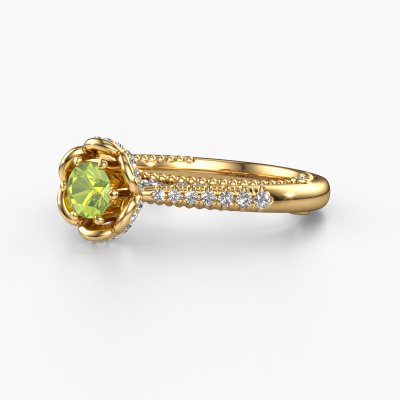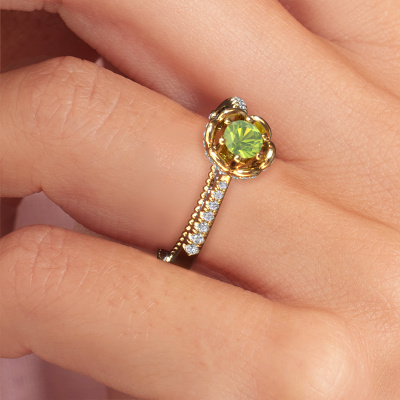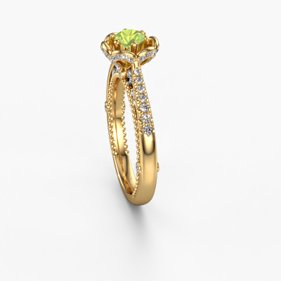 This 14 Carat gold ring is called Abbey and is set with 4.2 mm peridot. Is your girlfriend hooked on vintage? Then this gold pearl edges engagement ring will surely match her style perfectly. A trendy ring with just a hint of vintage adornment. A truly stunning, romantic design! Especially when you customize your ring to your own liking. This vintage pavé solitaire engagement ring is set with stunning peridot. As you can see, you are the boss in selecting a gemstone which matches the style of your girlfriend best. Each gemstone is carefully selected by our merchants whom are spread throughout the world. Nothing but the best gems for our expert goldsmith. After all, it is his crowning glory! Each jewel is made just for you, with attention to detail and design.By using our modern techniques, we can design and customize the finest quality jewels with the utmost care for you. Our engagement rings are always priced 30 percent lower than other jewellers. We make engagement rings to order so we don't have to maintain a large stock. If you have a certain budget, we are more than happy to advice you accordingly.Our designers and goldsmiths work together each day, creating new jewels. Perhaps you have found a nice vintage engagement ring somewhere, which can be used to customize your unique ring. Please feel free to contact us. We will make you an offer, based on a fair price/ quality ratio, which will amaze you.To make it easier for you, we offer a 30 day return policy. Check our terms and conditions.