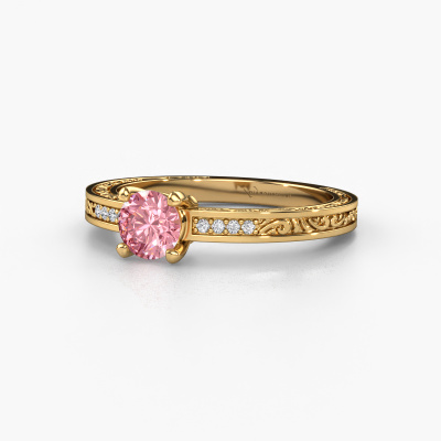 This 14 Carat gold ring is called Claudette 2 and is set with 5 mm pink lab grown diamond. Is your girlfriend hooked on vintage? Then this gold filigree engagement ring will surely match her style perfectly. A trendy ring with just a hint of Celtic adornment. A truly stunning, romantic design! Especially when you customize your ring to your own liking. This Celtic pavé solitaire engagement ring is set with stunning pink lab grown diamonds. As you can see, you are the boss in selecting a gemstone which matches the style of your girlfriend best. Each gemstone is carefully selected by our merchants whom are spread throughout the world. Nothing but the best gems for our expert goldsmith. After all, it is his crowning glory! Each jewel is made just for you by our master goldsmiths in our own studio.After receiving your order, our goldsmiths will start the creative process of making your Claudette 2 engagement ring. We don't keep stock. This is advantageous because these costs will not be passed on to you. Therefore, we can offer jewellery at exceptionally low prices.Do you have a specific ring in mind? One you came across somewhere. Please feel free to tell us your wishes and we will turn your design into a unique engagement ring. You can follow the development of your ring design because we use 3D drawings. This gives you a realistic preview of your design. We will gladly send you a non-binding offer, based on a fair price/ quality ratio. It will amaze you.To make it easier for you, we offer a 30 day return policy. Check our terms and conditions.