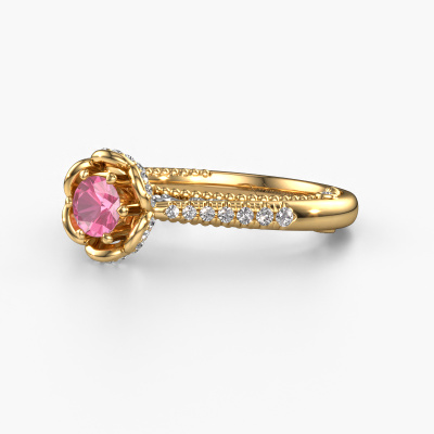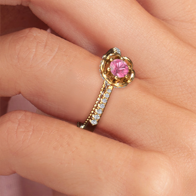 This 14 Carat gold ring is called Abbey and is set with 4.2 mm pink sapphire. Is your girlfriend hooked on vintage? Then this gold pearl edges engagement ring will surely match her style perfectly. A trendy ring with just a hint of vintage adornment. A truly stunning, romantic design! Especially when you customize your ring to your own liking. This vintage pavé solitaire engagement ring is set with stunning pink sapphire. As you can see, you are the boss in selecting a gemstone which matches the style of your girlfriend best. Each gemstone is carefully selected by our merchants whom are spread throughout the world. Nothing but the best gems for our expert goldsmith. After all, it is his crowning glory! Each jewel is made just for you, with attention to detail and design.By using our modern techniques, we can design and customize the finest quality jewels with the utmost care for you. Our engagement rings are always priced 30 percent lower than other jewellers. We make engagement rings to order so we don't have to maintain a large stock. If you have a certain budget, we are more than happy to advice you accordingly.Our designers and goldsmiths work together each day, creating new jewels. Perhaps you have found a nice vintage engagement ring somewhere, which can be used to customize your unique ring. Please feel free to contact us. We will make you an offer, based on a fair price/ quality ratio, which will amaze you.To make it easier for you, we offer a 30 day return policy. Check our terms and conditions.
