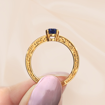This 14 Carat gold ring is called Claudette 2 and is set with 5 mm sapphire. Is your girlfriend hooked on vintage? Then this gold filigree engagement ring will surely match her style perfectly. A trendy ring with just a hint of Celtic adornment. A truly stunning, romantic design! Especially when you customize your ring to your own liking. This Celtic pavé solitaire engagement ring is set with stunning sapphire. As you can see, you are the boss in selecting a gemstone which matches the style of your girlfriend best. Each gemstone is carefully selected by our merchants whom are spread throughout the world. Nothing but the best gems for our expert goldsmith. After all, it is his crowning glory! Each jewel is made just for you by our master goldsmiths in our own studio.After receiving your order, our goldsmiths will start the creative process of making your Claudette 2 engagement ring. We don't keep stock. This is advantageous because these costs will not be passed on to you. Therefore, we can offer jewellery at exceptionally low prices.Do you have a specific ring in mind? One you came across somewhere. Please feel free to tell us your wishes and we will turn your design into a unique engagement ring. You can follow the development of your ring design because we use 3D drawings. This gives you a realistic preview of your design. We will gladly send you a non-binding offer, based on a fair price/ quality ratio. It will amaze you.To make it easier for you, we offer a 30 day return policy. Check our terms and conditions.