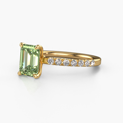 The ring shown above is called the Crystal EME 2, we call this a solitaire ring because it contains a single gemstone. The engagement ring is made in 14 Carat gold and has a emerald cut green lab grown diamond of 8x6 mm. This exclusive gold solitaire ring with exquisite emerald cut green lab grown diamond is a beautiful engagement ring. The open prong setting allows light to strike the gemstone from various angles. The ring also stands out because of the high positioning of the gemstone. Because diamonds symbolize true love and purity, they make the perfect gift for the love of your life. The symbol of eternal love is the centerpiece of this solitaire ring. Like a diamond, all other types of precious metal have their own attributed symbolic meaning. You can compile the pavé solitaire engagement ring yourself in various precious metal combinations. This one has the combination of 14 Carat gold with gold. Each piece of jewelry is made just for you by our master goldsmiths in our own studio.By using a combination of the latest modern techniques, combined with ancient crafting, we can make all our engagement rings in our own studio. Each jewel is made to order. This is advantageous because we can offer you a price you won't find anywhere else.Our team adds new designs to our online collection daily. Our designers and goldsmiths work together in creating the best design. We strive to offer a diverse collection of jewels. Perhaps you have a specific jewel design in mind. One you came across somewhere. Please contact us for a free consultation. We will make you an offer, based on a fair price/ quality ratio, that will baffle you.To make it easier for you, we offer a 30 day return policy. Check our terms and conditions.
