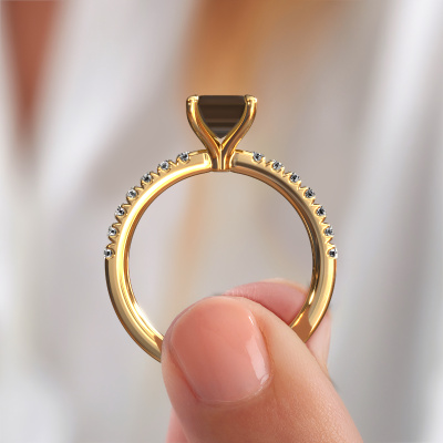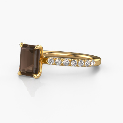 The ring shown above is called the Crystal EME 2, we call this a solitaire ring because it contains a single gemstone. The engagement ring is made in 14 Carat gold and has a emerald cut smokey quartz of 8x6 mm. This exclusive gold solitaire ring with exquisite emerald cut smokey quartz is a beautiful engagement ring. The open prong setting allows light to strike the gemstone from various angles. The ring also stands out because of the high positioning of the gemstone. Because diamonds symbolize true love and purity, they make the perfect gift for the love of your life. The symbol of eternal love is the centerpiece of this solitaire ring. Like a diamond, all other types of precious metal have their own attributed symbolic meaning. You can compile the pavé solitaire engagement ring yourself in various precious metal combinations. This one has the combination of 14 Carat gold with gold. Each piece of jewelry is made just for you by our master goldsmiths in our own studio.By using a combination of the latest modern techniques, combined with ancient crafting, we can make all our engagement rings in our own studio. Each jewel is made to order. This is advantageous because we can offer you a price you won't find anywhere else.Our team adds new designs to our online collection daily. Our designers and goldsmiths work together in creating the best design. We strive to offer a diverse collection of jewels. Perhaps you have a specific jewel design in mind. One you came across somewhere. Please contact us for a free consultation. We will make you an offer, based on a fair price/ quality ratio, that will baffle you.To make it easier for you, we offer a 30 day return policy. Check our terms and conditions.