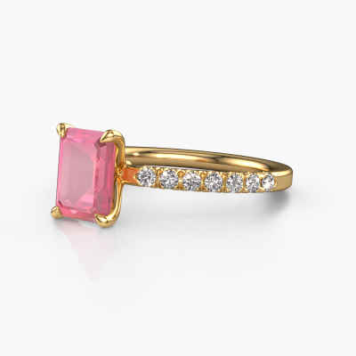 The ring shown above is called the Crystal EME 2, we call this a solitaire ring because it contains a single gemstone. The engagement ring is made in 14 Carat gold and has a emerald cut tourmaline pink of 8x6 mm. This exclusive gold solitaire ring with exquisite emerald cut tourmaline pink is a beautiful engagement ring. The open prong setting allows light to strike the gemstone from various angles. The ring also stands out because of the high positioning of the gemstone. Because diamonds symbolize true love and purity, they make the perfect gift for the love of your life. The symbol of eternal love is the centerpiece of this solitaire ring. Like a diamond, all other types of precious metal have their own attributed symbolic meaning. You can compile the pavé solitaire engagement ring yourself in various precious metal combinations. This one has the combination of 14 Carat gold with gold. Each piece of jewelry is made just for you by our master goldsmiths in our own studio.By using a combination of the latest modern techniques, combined with ancient crafting, we can make all our engagement rings in our own studio. Each jewel is made to order. This is advantageous because we can offer you a price you won't find anywhere else.Our team adds new designs to our online collection daily. Our designers and goldsmiths work together in creating the best design. We strive to offer a diverse collection of jewels. Perhaps you have a specific jewel design in mind. One you came across somewhere. Please contact us for a free consultation. We will make you an offer, based on a fair price/ quality ratio, that will baffle you.To make it easier for you, we offer a 30 day return policy. Check our terms and conditions.
