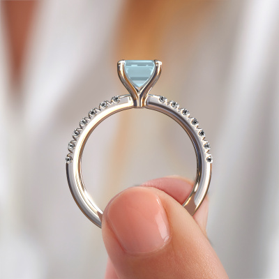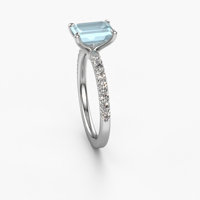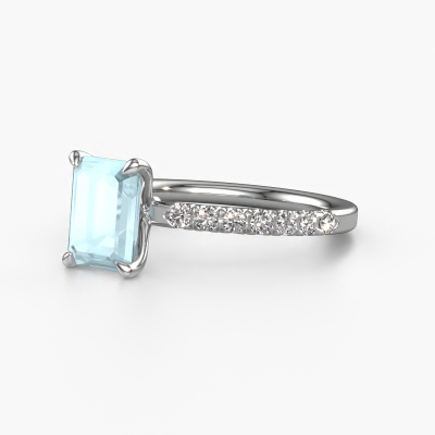 The ring shown above is called the Crystal EME 2, we call this a solitaire ring because it contains a single gemstone. The engagement ring is made in platinum and has a emerald cut aquamarine of 8x6 mm. This exclusive platinum solitaire ring with exquisite emerald cut aquamarine is a beautiful engagement ring. The open prong setting allows light to strike the gemstone from various angles. The ring also stands out because of the high positioning of the gemstone. Because diamonds symbolize true love and purity, they make the perfect gift for the love of your life. The symbol of eternal love is the centerpiece of this solitaire ring. Like a diamond, all other types of precious metal have their own attributed symbolic meaning. You can compile the pavé solitaire engagement ring yourself in various precious metal combinations. This one has the combination of platinum with platinum. Each piece of jewelry is made just for you by our master goldsmiths in our own studio.By using a combination of the latest modern techniques, combined with ancient crafting, we can make all our engagement rings in our own studio. Each jewel is made to order. This is advantageous because we can offer you a price you won't find anywhere else.Our team adds new designs to our online collection daily. Our designers and goldsmiths work together in creating the best design. We strive to offer a diverse collection of jewels. Perhaps you have a specific jewel design in mind. One you came across somewhere. Please contact us for a free consultation. We will make you an offer, based on a fair price/ quality ratio, that will baffle you.To make it easier for you, we offer a 30 day return policy. Check our terms and conditions.