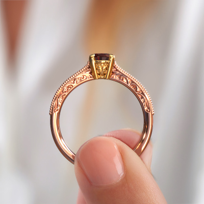 This 14 Carat rose gold ring is called Shonta OVL and is set with 7x5 mm garnet. Is your girlfriend hooked on vintage? Then this rose gold pearl designs engagement ring will surely match her style perfectly. A trendy ring with just a hint of fantasy adornment. A truly stunning, romantic design! Especially when you customize your ring to your own liking. This fantasy pavé solitaire engagement ring is set with stunning garnet. As you can see, you are the boss in selecting a gemstone which matches the style of your girlfriend best. Each gemstone is carefully selected by our merchants whom are spread throughout the world. Nothing but the best gems for our expert goldsmith. After all, it is his crowning glory! Each jewel is unique in every way! Simply customize to your liking,By using a combination of the latest modern techniques, combined with ancient crafting, we can make all our engagement rings in our own studio. Each jewel is made to order. This is advantageous because we can offer you a price you won't find anywhere else.Our team adds new designs to our online collection daily. Our designers and goldsmiths work together in creating the best design. We strive to offer a diverse collection of jewels. Perhaps you have a specific jewel design in mind. One you came across somewhere. Please contact us for a free consultation. We will make you an offer, based on a fair price/ quality ratio, that will baffle you.To make it easier for you, we offer a 30 day return policy. Check our terms and conditions.