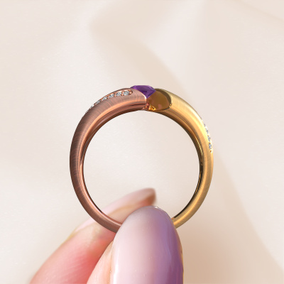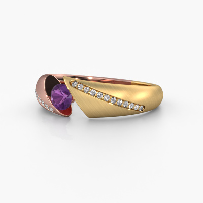 This 14 Carat rose gold ring is called Hojalien 2 and is set with amethyst. Do you keep up with the latest fashion trends? Do you want a unique engagement ring that matches your lifestyle? This graceful engagement ring is an extraordinary ring which can be custom-made to fit your or her personal style. This modern rose gold engagement ring is set with amethyst. Our amethysten are carefully selected for this specific ring in order to create the best effect. Our expert goldsmith will create your ring in our own artisan studio where the amethyst will be set with great care. The ring will then be polished to perfection. Nothing but the best for the love of your life! This jewel is made by a team of passionate goldsmiths and jewel designers. This will make your crown jewel truly eye-catching.Because we design and deliver our own rings, we can offer you a engagement ring at a price you won't find anywhere else. A ring is made to order, which helps prevent excess supplies, so we can make you a great price offer. We understand it feels risky, buying your engagement ring online, but we will gladly assist in the designing process, taking your budget into consideration.Our team adds new designs to our online collection daily. Our designers and goldsmiths work together in creating the best design. We strive to offer a diverse collection of jewels. Perhaps you have a specific jewel design in mind. One you came across somewhere. Please contact us for a free consultation. We will make you an offer, based on a fair price/ quality ratio, that will baffle you.To make it easier for you, we offer a 30 day return policy. Check our terms and conditions.