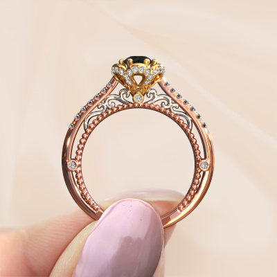 This 14 Carat rose gold ring is called Abbey and is set with 0.642 crt black diamond. Is your girlfriend hooked on vintage? Then this rose gold pearl edges engagement ring will surely match her style perfectly. A trendy ring with just a hint of vintage adornment. A truly stunning, romantic design! Especially when you customize your ring to your own liking. This vintage pavé solitaire engagement ring is set with stunning black diamonds. As you can see, you are the boss in selecting a gemstone which matches the style of your girlfriend best. Each gemstone is carefully selected by our merchants whom are spread throughout the world. Nothing but the best gems for our expert goldsmith. After all, it is his crowning glory! Each jewel is made just for you, with attention to detail and design.By using our modern techniques, we can design and customize the finest quality jewels with the utmost care for you. Our engagement rings are always priced 30 percent lower than other jewellers. We make engagement rings to order so we don't have to maintain a large stock. If you have a certain budget, we are more than happy to advice you accordingly.Our designers and goldsmiths work together each day, creating new jewels. Perhaps you have found a nice vintage engagement ring somewhere, which can be used to customize your unique ring. Please feel free to contact us. We will make you an offer, based on a fair price/ quality ratio, which will amaze you.To make it easier for you, we offer a 30 day return policy. Check our terms and conditions.