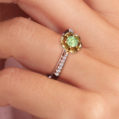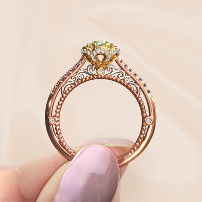 This 14 Carat rose gold ring is called Abbey and is set with 4.2 mm green lab grown diamond. Is your girlfriend hooked on vintage? Then this rose gold pearl edges engagement ring will surely match her style perfectly. A trendy ring with just a hint of vintage adornment. A truly stunning, romantic design! Especially when you customize your ring to your own liking. This vintage pavé solitaire engagement ring is set with stunning green lab grown diamonds. As you can see, you are the boss in selecting a gemstone which matches the style of your girlfriend best. Each gemstone is carefully selected by our merchants whom are spread throughout the world. Nothing but the best gems for our expert goldsmith. After all, it is his crowning glory! Each jewel is made just for you, with attention to detail and design.