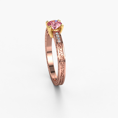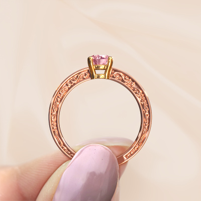This 14 Carat rose gold ring is called Claudette 2 and is set with 5 mm pink lab grown diamond. Is your girlfriend hooked on vintage? Then this rose gold filigree engagement ring will surely match her style perfectly. A trendy ring with just a hint of Celtic adornment. A truly stunning, romantic design! Especially when you customize your ring to your own liking. This Celtic pavé solitaire engagement ring is set with stunning pink lab grown diamonds. As you can see, you are the boss in selecting a gemstone which matches the style of your girlfriend best. Each gemstone is carefully selected by our merchants whom are spread throughout the world. Nothing but the best gems for our expert goldsmith. After all, it is his crowning glory! Each jewel is made just for you by our master goldsmiths in our own studio.After receiving your order, our goldsmiths will start the creative process of making your Claudette 2 engagement ring. We don't keep stock. This is advantageous because these costs will not be passed on to you. Therefore, we can offer jewellery at exceptionally low prices.Do you have a specific ring in mind? One you came across somewhere. Please feel free to tell us your wishes and we will turn your design into a unique engagement ring. You can follow the development of your ring design because we use 3D drawings. This gives you a realistic preview of your design. We will gladly send you a non-binding offer, based on a fair price/ quality ratio. It will amaze you.To make it easier for you, we offer a 30 day return policy. Check our terms and conditions.