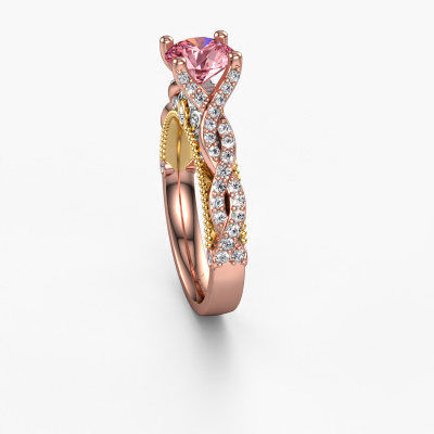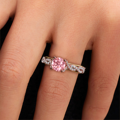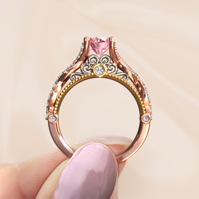 This 14 Carat rose gold ring is called Chantelle and is set with 6.5 mm pink lab grown diamond. Is your girlfriend hooked on vintage? Then this rose gold daring engagement ring will surely match her style perfectly. A trendy ring with just a hint of vintage adornment. A truly stunning, romantic design! Especially when you customize your ring to your own liking. This vintage pavé solitaire engagement ring is set with stunning pink lab grown diamonds. As you can see, you are the boss in selecting a gemstone which matches the style of your girlfriend best. Each gemstone is carefully selected by our merchants whom are spread throughout the world. Nothing but the best gems for our expert goldsmith. After all, it is his crowning glory! Each jewel is made by a team of passionate goldsmiths and jewel designers. This will make your crown jewel truly eye-catching.Are you on a budget? Please feel free to contact us, so we can go discuss your options. We offer our engagement rings at guaranteed best price, because we make them to order. You won't find such a price anywhere else!Our designers and goldsmiths work together each day, creating new jewels. Perhaps you have found a nice vintage engagement ring somewhere, which can be used to customize your unique ring. Please feel free to contact us. We will make you an offer, based on a fair price/ quality ratio, which will amaze you.To make it easier for you, we offer a 30 day return policy. Check our terms and conditions.