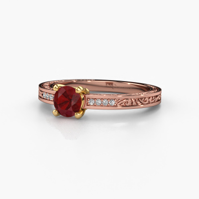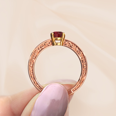 This 14 Carat rose gold ring is called Claudette 2 and is set with 5 mm ruby. Is your girlfriend hooked on vintage? Then this rose gold filigree engagement ring will surely match her style perfectly. A trendy ring with just a hint of Celtic adornment. A truly stunning, romantic design! Especially when you customize your ring to your own liking. This Celtic pavé solitaire engagement ring is set with stunning ruby. As you can see, you are the boss in selecting a gemstone which matches the style of your girlfriend best. Each gemstone is carefully selected by our merchants whom are spread throughout the world. Nothing but the best gems for our expert goldsmith. After all, it is his crowning glory! Each jewel is made just for you by our master goldsmiths in our own studio.After receiving your order, our goldsmiths will start the creative process of making your Claudette 2 engagement ring. We don't keep stock. This is advantageous because these costs will not be passed on to you. Therefore, we can offer jewellery at exceptionally low prices.Do you have a specific ring in mind? One you came across somewhere. Please feel free to tell us your wishes and we will turn your design into a unique engagement ring. You can follow the development of your ring design because we use 3D drawings. This gives you a realistic preview of your design. We will gladly send you a non-binding offer, based on a fair price/ quality ratio. It will amaze you.To make it easier for you, we offer a 30 day return policy. Check our terms and conditions.
