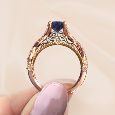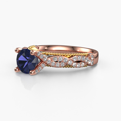 This 14 Carat rose gold ring is called Chantelle and is set with 6.5 mm sapphire. Is your girlfriend hooked on vintage? Then this rose gold daring engagement ring will surely match her style perfectly. A trendy ring with just a hint of vintage adornment. A truly stunning, romantic design! Especially when you customize your ring to your own liking. This vintage pavé solitaire engagement ring is set with stunning sapphire. As you can see, you are the boss in selecting a gemstone which matches the style of your girlfriend best. Each gemstone is carefully selected by our merchants whom are spread throughout the world. Nothing but the best gems for our expert goldsmith. After all, it is his crowning glory! Each jewel is made by a team of passionate goldsmiths and jewel designers. This will make your crown jewel truly eye-catching.Are you on a budget? Please feel free to contact us, so we can go discuss your options. We offer our engagement rings at guaranteed best price, because we make them to order. You won't find such a price anywhere else!Our designers and goldsmiths work together each day, creating new jewels. Perhaps you have found a nice vintage engagement ring somewhere, which can be used to customize your unique ring. Please feel free to contact us. We will make you an offer, based on a fair price/ quality ratio, which will amaze you.To make it easier for you, we offer a 30 day return policy. Check our terms and conditions.