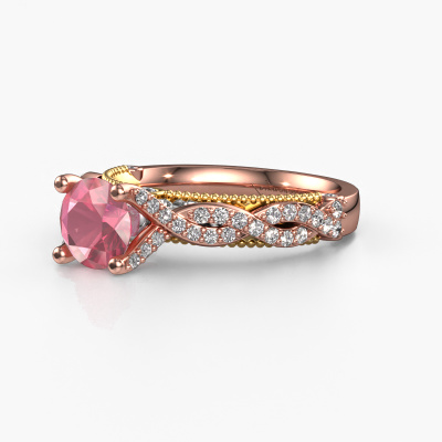 This 14 Carat rose gold ring is called Chantelle and is set with 6.5 mm tourmaline pink. Is your girlfriend hooked on vintage? Then this rose gold daring engagement ring will surely match her style perfectly. A trendy ring with just a hint of vintage adornment. A truly stunning, romantic design! Especially when you customize your ring to your own liking. This vintage pavé solitaire engagement ring is set with stunning tourmaline pink. As you can see, you are the boss in selecting a gemstone which matches the style of your girlfriend best. Each gemstone is carefully selected by our merchants whom are spread throughout the world. Nothing but the best gems for our expert goldsmith. After all, it is his crowning glory! Each jewel is made by a team of passionate goldsmiths and jewel designers. This will make your crown jewel truly eye-catching.Are you on a budget? Please feel free to contact us, so we can go discuss your options. We offer our engagement rings at guaranteed best price, because we make them to order. You won't find such a price anywhere else!Our designers and goldsmiths work together each day, creating new jewels. Perhaps you have found a nice vintage engagement ring somewhere, which can be used to customize your unique ring. Please feel free to contact us. We will make you an offer, based on a fair price/ quality ratio, which will amaze you.To make it easier for you, we offer a 30 day return policy. Check our terms and conditions.