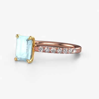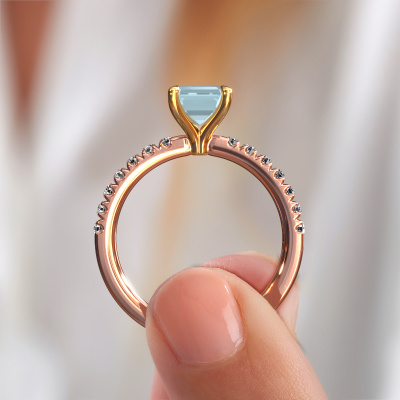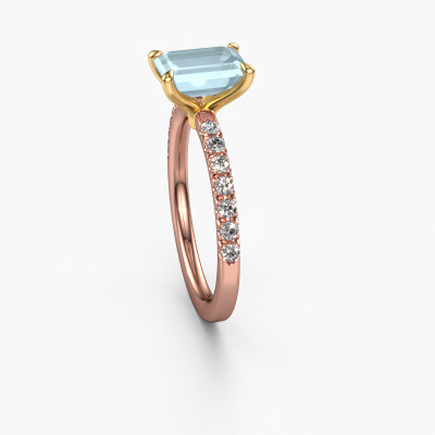 The ring shown above is called the Crystal EME 2, we call this a solitaire ring because it contains a single gemstone. The engagement ring is made in 14 Carat rose gold and has a emerald cut aquamarine of 8x6 mm. This exclusive rose gold solitaire ring with exquisite emerald cut aquamarine is a beautiful engagement ring. The open prong setting allows light to strike the gemstone from various angles. The ring also stands out because of the high positioning of the gemstone. Because diamonds symbolize true love and purity, they make the perfect gift for the love of your life. The symbol of eternal love is the centerpiece of this solitaire ring. Like a diamond, all other types of precious metal have their own attributed symbolic meaning. You can compile the pavé solitaire engagement ring yourself in various precious metal combinations. This one has the combination of 14 Carat rose gold with gold. Each piece of jewelry is made just for you by our master goldsmiths in our own studio.By using a combination of the latest modern techniques, combined with ancient crafting, we can make all our engagement rings in our own studio. Each jewel is made to order. This is advantageous because we can offer you a price you won't find anywhere else.Our team adds new designs to our online collection daily. Our designers and goldsmiths work together in creating the best design. We strive to offer a diverse collection of jewels. Perhaps you have a specific jewel design in mind. One you came across somewhere. Please contact us for a free consultation. We will make you an offer, based on a fair price/ quality ratio, that will baffle you.To make it easier for you, we offer a 30 day return policy. Check our terms and conditions.