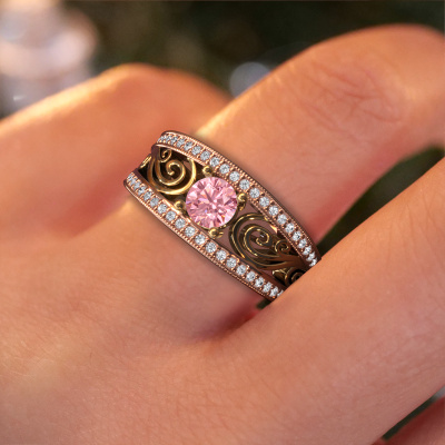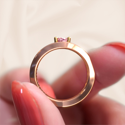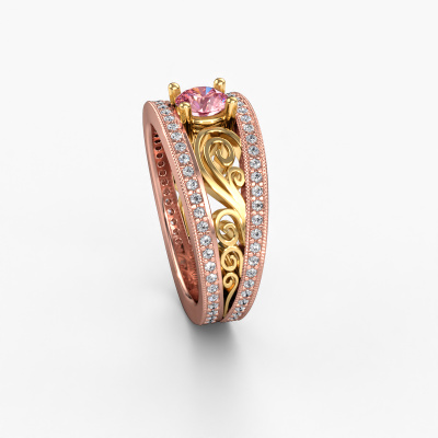 This 14 Carat rose gold ring is called Julliana and is set with 5 mm pink lab grown diamond. For you, there is only one person in your life who stands out in a crowd. Only one that makes your heart skip a beat. A true gem! She, above all others, deserves a special gift. A unique customized jewel made in her honour. We believe this ring is perfect for your special moment. Each detail of this exclusive rose gold pavé solitaire engagement ring is selected by hand, crafted and polished by our expert goldsmith in our own artisan studio. We strive to achieve the perfect design and composition of the ring, so it enhances the unique features of our pink lab grown diamonds, and lets them shine even brighter. It takes a lot of precision to make but in the end it pays off because of the sheer beauty of the ring. And that is our main goal. It's what gets us excited. The great thing about our online tool is, that you can design your own jewellery into a unique, personalized piece. This unique filigree engagement ring is created with the precious metal combination of rose gold and gold. But of course you are completely free to select other colours. Each piece of jewellery is made just for you by our master goldsmiths in our own studio.By using our modern techniques, we can design and customize the finest quality jewels with the utmost care for you. Our engagement rings are always priced 30 percent lower than other jewellers. We make engagement rings to order so we don't have to maintain a large stock. If you have a certain budget, we are more than happy to advice you accordingly.Our team adds new designs to our online collection daily. Our designers and goldsmiths work together in creating the best design. We strive to offer a diverse collection of jewels. Perhaps you have a specific jewel design in mind. One you came across somewhere. Please contact us for a free consultation. We will make you an offer, based on a fair price/ quality ratio, that will baffle you.To make it easier for you, we offer a 30 day return policy. Check our terms and conditions.