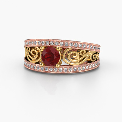 This 14 Carat rose gold ring is called Julliana and is set with 5 mm ruby. For you, there is only one person in your life who stands out in a crowd. Only one that makes your heart skip a beat. A true gem! She, above all others, deserves a special gift. A unique customized jewel made in her honour. We believe this ring is perfect for your special moment. Each detail of this exclusive rose gold pavé solitaire engagement ring is selected by hand, crafted and polished by our expert goldsmith in our own artisan studio. We strive to achieve the perfect design and composition of the ring, so it enhances the unique features of our ruby, and lets them shine even brighter. It takes a lot of precision to make but in the end it pays off because of the sheer beauty of the ring. And that is our main goal. It's what gets us excited. The great thing about our online tool is, that you can design your own jewellery into a unique, personalized piece. This unique filigree engagement ring is created with the precious metal combination of rose gold and gold. But of course you are completely free to select other colours. Each piece of jewellery is made just for you by our master goldsmiths in our own studio.By using our modern techniques, we can design and customize the finest quality jewels with the utmost care for you. Our engagement rings are always priced 30 percent lower than other jewellers. We make engagement rings to order so we don't have to maintain a large stock. If you have a certain budget, we are more than happy to advice you accordingly.Our team adds new designs to our online collection daily. Our designers and goldsmiths work together in creating the best design. We strive to offer a diverse collection of jewels. Perhaps you have a specific jewel design in mind. One you came across somewhere. Please contact us for a free consultation. We will make you an offer, based on a fair price/ quality ratio, that will baffle you.To make it easier for you, we offer a 30 day return policy. Check our terms and conditions.