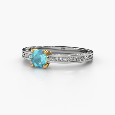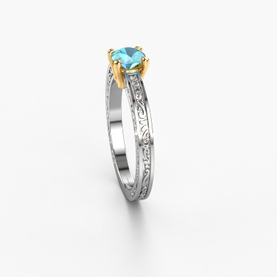 This 14 Carat white gold ring is called Claudette 2 and is set with 5 mm blue topaz. Is your girlfriend hooked on vintage? Then this white gold filigree engagement ring will surely match her style perfectly. A trendy ring with just a hint of Celtic adornment. A truly stunning, romantic design! Especially when you customize your ring to your own liking. This Celtic pavé solitaire engagement ring is set with stunning blue topaz. As you can see, you are the boss in selecting a gemstone which matches the style of your girlfriend best. Each gemstone is carefully selected by our merchants whom are spread throughout the world. Nothing but the best gems for our expert goldsmith. After all, it is his crowning glory! Each jewel is made just for you by our master goldsmiths in our own studio.After receiving your order, our goldsmiths will start the creative process of making your Claudette 2 engagement ring. We don't keep stock. This is advantageous because these costs will not be passed on to you. Therefore, we can offer jewellery at exceptionally low prices.Do you have a specific ring in mind? One you came across somewhere. Please feel free to tell us your wishes and we will turn your design into a unique engagement ring. You can follow the development of your ring design because we use 3D drawings. This gives you a realistic preview of your design. We will gladly send you a non-binding offer, based on a fair price/ quality ratio. It will amaze you.To make it easier for you, we offer a 30 day return policy. Check our terms and conditions.