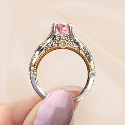 This 14 Carat white gold ring is called Chantelle and is set with 6.5 mm pink lab grown diamond. Is your girlfriend hooked on vintage? Then this white gold daring engagement ring will surely match her style perfectly. A trendy ring with just a hint of vintage adornment. A truly stunning, romantic design! Especially when you customize your ring to your own liking. This vintage pavé solitaire engagement ring is set with stunning pink lab grown diamonds. As you can see, you are the boss in selecting a gemstone which matches the style of your girlfriend best. Each gemstone is carefully selected by our merchants whom are spread throughout the world. Nothing but the best gems for our expert goldsmith. After all, it is his crowning glory! Each jewel is made by a team of passionate goldsmiths and jewel designers. This will make your crown jewel truly eye-catching.Are you on a budget? Please feel free to contact us, so we can go discuss your options. We offer our engagement rings at guaranteed best price, because we make them to order. You won't find such a price anywhere else!Our designers and goldsmiths work together each day, creating new jewels. Perhaps you have found a nice vintage engagement ring somewhere, which can be used to customize your unique ring. Please feel free to contact us. We will make you an offer, based on a fair price/ quality ratio, which will amaze you.To make it easier for you, we offer a 30 day return policy. Check our terms and conditions.