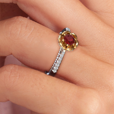 This 14 Carat white gold ring is called Abbey and is set with 4.2 mm ruby. Is your girlfriend hooked on vintage? Then this white gold pearl edges engagement ring will surely match her style perfectly. A trendy ring with just a hint of vintage adornment. A truly stunning, romantic design! Especially when you customize your ring to your own liking. This vintage pavé solitaire engagement ring is set with stunning ruby. As you can see, you are the boss in selecting a gemstone which matches the style of your girlfriend best. Each gemstone is carefully selected by our merchants whom are spread throughout the world. Nothing but the best gems for our expert goldsmith. After all, it is his crowning glory! Each jewel is made just for you, with attention to detail and design.By using our modern techniques, we can design and customize the finest quality jewels with the utmost care for you. Our engagement rings are always priced 30 percent lower than other jewellers. We make engagement rings to order so we don't have to maintain a large stock. If you have a certain budget, we are more than happy to advice you accordingly.Our designers and goldsmiths work together each day, creating new jewels. Perhaps you have found a nice vintage engagement ring somewhere, which can be used to customize your unique ring. Please feel free to contact us. We will make you an offer, based on a fair price/ quality ratio, which will amaze you.To make it easier for you, we offer a 30 day return policy. Check our terms and conditions.