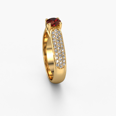 The ring shown above is called the Leoness. We call this type of ring a pavé solitaire ring. The centre gemstone is surrounded by smaller sized stones. This 14 Carat gold version is set with a 5 mm round garnet centre stone, embraced by smaller diamonds. What makes this classic gold pavé solitaire ring special is the setting of the smaller gems surrounding the centre garnet, which are shaped like a beautiful flower. The surrounding pavé solitaire of stones frame the middle centre stone in such a way to make it appear bigger. This type of engagement ring is also called a flower ring. It is very important that the smaller diamonds are positioned identically so there is no interference of light but perfect unity instead. Our skilled Goldsmiths get the job done. Each individual stone is carefully set by hand. During manufacturing, light fall is constantly monitored to make sure the special pavé solitaire effect is still visible. In the end you get the perfect engagement ring with a radiant garnet gemstone centrepiece. You can imagine the effect of a ring of such significance when you give tot the love of your life on her special day to shine. This jewel is unique in every way! Simply customize to your liking,By using our modern techniques, we can design and customize the finest quality jewels with the utmost care for you. Our engagement rings are always priced 30 percent lower than other jewellers. We make engagement rings to order so we don't have to maintain a large stock. If you have a certain budget, we are more than happy to advice you accordingly.Have you found a specific engagement ring somewhere which you would like to give to your loved one? Please feel free to express your wishes to our jewel designers because we would be honoured to turn your design into a classic engagement ring. You can follow the development of your ring design because we use 3D drawings. This gives you a realistic preview of how your design will look. You can also preorder a dummy. A dummy is a plastic ring, which can be shaped according your ring design. You can try it on and check if its width and size are suitable for you. We will gladly send you a non-binding offer, based on a fair price/ quality ratio. It will amaze you, considering the quality of the ring and gemstones.To make it easier for you, we offer a 30 day return policy. Check our terms and conditions.