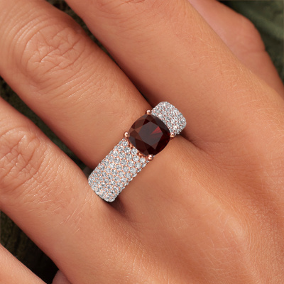 This 14 Carat rose gold ring is called Darcy and is set with 7 mm garnet. This exclusive rose gold pavé solitaire Engagement ring is a true work of art! The ornaments are crafted with a lot of patience and great passion. In order to create this ring with great precision, this craft requires a keen eye and skilful hand. A challenge which ignites a fire in our expert goldsmith. The exquisite garnet are set in a special way so they stand out even more. This gives the ring an even more glamorous appearance. The pavé Engagement ring is actually unique on its own because of the gemstones which we carefully select especially for this ring. On top of that you select the precious metals which will be used to create a unique ring for the most extraordinary woman in your life! This jewel is unique in every way! Simply customize to your likingBecause we design and deliver our own rings, we can offer you a Engagement ring at a price you won't find anywhere else. A ring is made to order, which helps prevent excess supplies, so we can make you a great price offer. We understand it feels risky, buying your Engagement ring online, but we will gladly assist in the designing process, taking your budget into consideration.Different styles of new rings are made daily by our team. Perhaps you have found a pavé solitaire Engagement ring somewhere. One you would like to give to your loved one. Please feel free to share your thoughts and design with our jewel designers. We would love to turn your design into a exclusive Engagement ring. You can follow the development of your ring design because we use very detailed 3D drawings. On top of that, you can order a dummy of the design. A dummy is a plastic ring, which can be shaped according your ring design. You can try it on and check if the Engagement ring is up to standard. We will gladly send you a non-binding offer, based on a fair price/ quality ratio. The offer will baffle you, considering the quality of the ring and gemstones.To make it easier for you, we offer a 30 day return policy. Check our terms and conditions.