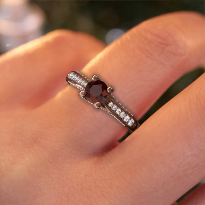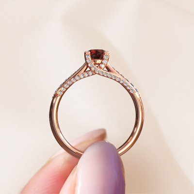 This 14 Carat rose gold ring is called Mia 3 and is set with 5 mm garnet. This exclusive rose gold pavé solitaire engagement ring is a true work of art! The ornaments are crafted with a lot of patience and great passion. In order to create this ring with great precision, this craft requires a keen eye and skilful hand. A challenge which ignites a fire in our expert goldsmith. The exquisite garnet are set in a special way so they stand out even more. This gives the ring an even more glamorous appearance. The shiny engagement ring is actually unique on its own because of the gemstones which we carefully select especially for this ring. On top of that you select the precious metals which will be used to create a unique ring for the most extraordinary woman in your life! This jewel is unique in every way! Simply customize to your likingAre you on a budget? Please feel free to contact us, so we can go discuss your options. We offer our engagement rings at guaranteed best price, because we make them to order. You won't find such a price anywhere else!Our team adds new designs to our online collection daily. Our designers and goldsmiths work together in creating the best design. We strive to offer a diverse collection of jewels. Perhaps you have a specific jewel design in mind. One you came across somewhere. Please contact us for a free consultation. We will make you an offer, based on a fair price/ quality ratio, that will baffle you.To make it easier for you, we offer a 30 day return policy. Check our terms and conditions.