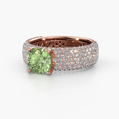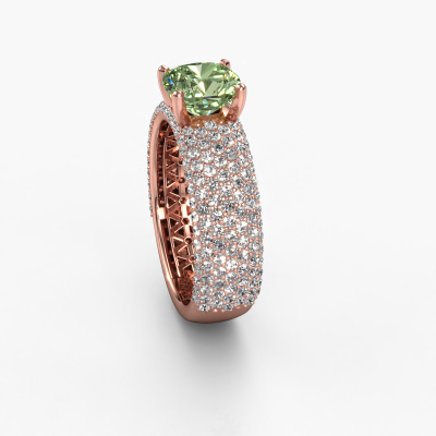 This 14 Carat rose gold ring is called Darcy and is set with 7 mm green lab grown diamond. This exclusive rose gold pavé solitaire Engagement ring is a true work of art! The ornaments are crafted with a lot of patience and great passion. In order to create this ring with great precision, this craft requires a keen eye and skilful hand. A challenge which ignites a fire in our expert goldsmith. The exquisite green lab grown diamonds are set in a special way so they stand out even more. This gives the ring an even more glamorous appearance. The pavé Engagement ring is actually unique on its own because of the gemstones which we carefully select especially for this ring. On top of that you select the precious metals which will be used to create a unique ring for the most extraordinary woman in your life! This jewel is unique in every way! Simply customize to your likingBecause we design and deliver our own rings, we can offer you a Engagement ring at a price you won't find anywhere else. A ring is made to order, which helps prevent excess supplies, so we can make you a great price offer. We understand it feels risky, buying your Engagement ring online, but we will gladly assist in the designing process, taking your budget into consideration.Different styles of new rings are made daily by our team. Perhaps you have found a pavé solitaire Engagement ring somewhere. One you would like to give to your loved one. Please feel free to share your thoughts and design with our jewel designers. We would love to turn your design into a exclusive Engagement ring. You can follow the development of your ring design because we use very detailed 3D drawings. On top of that, you can order a dummy of the design. A dummy is a plastic ring, which can be shaped according your ring design. You can try it on and check if the Engagement ring is up to standard. We will gladly send you a non-binding offer, based on a fair price/ quality ratio. The offer will baffle you, considering the quality of the ring and gemstones.To make it easier for you, we offer a 30 day return policy. Check our terms and conditions.