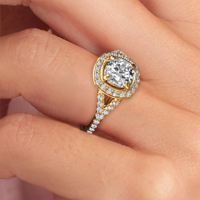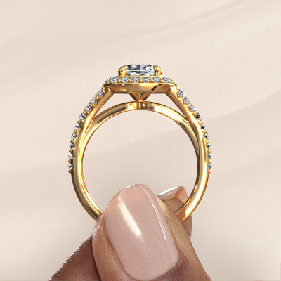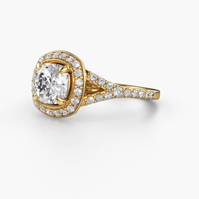 The ring shown above is called the Pamela CUS. We call this type of ring a halo ring because it has one centre gemstone and a band that is also pave set with gemstones. The 14 Carat gold engagement ring is set with a cushion 1.50 crt lab grown diamond centre stone and the band is pave set with lab-grown diamonds. What makes this luxury gold pavé solitaire ring special are the smaller sized stones embracing the centre stone. This gorgeous engagement ring is called a pavé solitaire ring because the smaller gemstones give the centre stone a pavé solitaire of surrounding light. In order for the smaller stones to enhance the centre stone, they have to be placed so there is no interference of light. And that's when our expert goldsmiths come in. Each individual stone is carefully set in the ring by hand. During manufacturing, light fall is constantly monitored to make sure the special pavé solitaire is still visible. In the end you get a unique engagement ring, with a lab grown diamond of your choosing at its centre. You can imagine the effect of a ring of such significance when you give it to her on her special day to shine. After receiving your order, our goldsmiths will passionately start the creative process of making your engagement ring in our own studio. Because we don't have a big stockpile, these costs will not be passed on to you. Our pricing is proof of that! We offer top quality jewels at lowest price, guaranteed.Different styles of new rings are made daily by our team. Perhaps you have found a pavé solitaire engagement ring somewhere. One you would like to give to your loved one. Please feel free to share your thoughts and design with our jewel designers. We would love to turn your design into a luxury engagement ring. You can follow the development of your ring design because we use very detailed 3D drawings. On top of that, you can order a dummy of the design. A dummy is a plastic ring, which can be shaped according your ring design. You can try it on and check if the engagement ring is up to standard. We will gladly send you a non-binding offer, based on a fair price/ quality ratio. The offer will baffle you, considering the quality of the ring and gemstones.To make it easier for you, we offer a 30 day return policy. Check our terms and conditions.