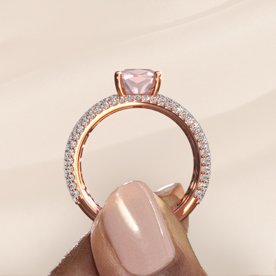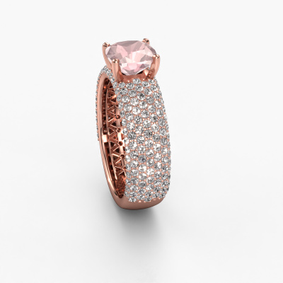 This 14 Carat rose gold ring is called Darcy and is set with 7 mm morganite champagne. This exclusive rose gold pavé solitaire Engagement ring is a true work of art! The ornaments are crafted with a lot of patience and great passion. In order to create this ring with great precision, this craft requires a keen eye and skilful hand. A challenge which ignites a fire in our expert goldsmith. The exquisite morganite champagne are set in a special way so they stand out even more. This gives the ring an even more glamorous appearance. The pavé Engagement ring is actually unique on its own because of the gemstones which we carefully select especially for this ring. On top of that you select the precious metals which will be used to create a unique ring for the most extraordinary woman in your life! This jewel is unique in every way! Simply customize to your likingBecause we design and deliver our own rings, we can offer you a Engagement ring at a price you won't find anywhere else. A ring is made to order, which helps prevent excess supplies, so we can make you a great price offer. We understand it feels risky, buying your Engagement ring online, but we will gladly assist in the designing process, taking your budget into consideration.Different styles of new rings are made daily by our team. Perhaps you have found a pavé solitaire Engagement ring somewhere. One you would like to give to your loved one. Please feel free to share your thoughts and design with our jewel designers. We would love to turn your design into a exclusive Engagement ring. You can follow the development of your ring design because we use very detailed 3D drawings. On top of that, you can order a dummy of the design. A dummy is a plastic ring, which can be shaped according your ring design. You can try it on and check if the Engagement ring is up to standard. We will gladly send you a non-binding offer, based on a fair price/ quality ratio. The offer will baffle you, considering the quality of the ring and gemstones.To make it easier for you, we offer a 30 day return policy. Check our terms and conditions.