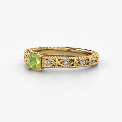 This 14 Carat gold ring is called Ardella and is set with 4 mm peridot. An extraordinary gold vintage ring. One that will surely make the love of your life shine like a diamond! That is what we hope to achieve. This vintage engagement ring is set with exquisite peridot. Whichever gemstone you choose from our selection, is up to you. The gemstone is selected with great care because we believe your filigree engagement ring must be adorned with nothing but the most beautiful gemstone. Wouldn't you agree? Our expert goldsmith will design your ring in our own crafting studio, where the peridot will be set with great precision. The ring will then be polished till it shines perfectly. Nothing but the best for the love of your life! This jewel is made just for you by our master goldsmiths in our own studio.After receiving your order, our goldsmiths will passionately start the creative process of making your engagement ring in our own studio. Because we don't have a big stockpile, these costs will not be passed on to you. Our pricing is proof of that! We offer top quality jewels at lowest price, guaranteed.Different styles of new rings are made daily by our team. Perhaps you have found a pavé solitaire engagement ring somewhere. One you would like to give to your loved one. Please feel free to share your thoughts and design with our jewel designers. We would love to turn your design into a vintage engagement ring. You can follow the development of your ring design because we use very detailed 3D drawings. On top of that, you can order a dummy of the design. A dummy is a plastic ring, which can be shaped according your ring design. You can try it on and check if the engagement ring is up to standard. We will gladly send you a non-binding offer, based on a fair price/ quality ratio. The offer will baffle you, considering the quality of the ring and gemstones.To make it easier for you, we offer a 30 day return policy. Check our terms and conditions.