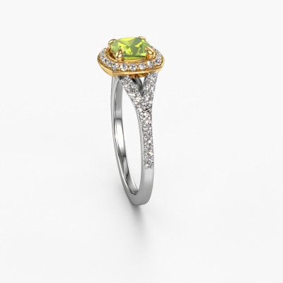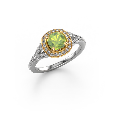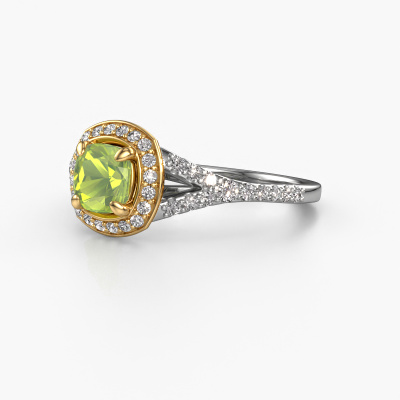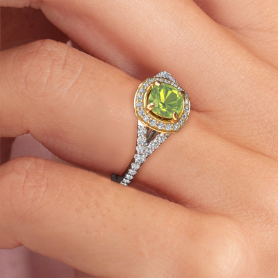 The ring shown above is called the Pamela CUS. We call this type of ring a halo ring because it has one centre gemstone and a band that is also pave set with gemstones. The 14 Carat white gold engagement ring is set with a cushion 5.5 mm peridot centre stone and the band is pave set with lab-grown diamonds. What makes this luxury white gold pavé solitaire ring special are the smaller sized stones embracing the centre stone. This gorgeous engagement ring is called a pavé solitaire ring because the smaller gemstones give the centre stone a pavé solitaire of surrounding light. In order for the smaller stones to enhance the centre stone, they have to be placed so there is no interference of light. And that's when our expert goldsmiths come in. Each individual stone is carefully set in the ring by hand. During manufacturing, light fall is constantly monitored to make sure the special pavé solitaire is still visible. In the end you get a unique engagement ring, with a peridot of your choosing at its centre. You can imagine the effect of a ring of such significance when you give it to her on her special day to shine. After receiving your order, our goldsmiths will passionately start the creative process of making your engagement ring in our own studio. Because we don't have a big stockpile, these costs will not be passed on to you. Our pricing is proof of that! We offer top quality jewels at lowest price, guaranteed.Different styles of new rings are made daily by our team. Perhaps you have found a pavé solitaire engagement ring somewhere. One you would like to give to your loved one. Please feel free to share your thoughts and design with our jewel designers. We would love to turn your design into a luxury engagement ring. You can follow the development of your ring design because we use very detailed 3D drawings. On top of that, you can order a dummy of the design. A dummy is a plastic ring, which can be shaped according your ring design. You can try it on and check if the engagement ring is up to standard. We will gladly send you a non-binding offer, based on a fair price/ quality ratio. The offer will baffle you, considering the quality of the ring and gemstones.To make it easier for you, we offer a 30 day return policy. Check our terms and conditions.