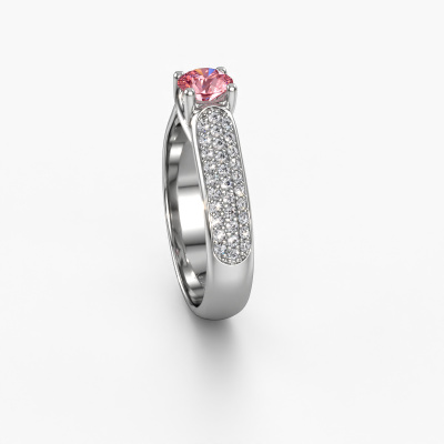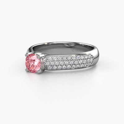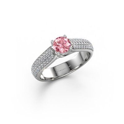 The ring shown above is called the Leoness. We call this type of ring a pavé solitaire ring. The centre gemstone is surrounded by smaller sized stones. This platinum version is set with a 5 mm round pink lab grown diamond centre stone, embraced by smaller diamonds. What makes this classic platinum pavé solitaire ring special is the setting of the smaller gems surrounding the centre pink lab grown diamond, which are shaped like a beautiful flower. The surrounding pavé solitaire of stones frame the middle centre stone in such a way to make it appear bigger. This type of engagement ring is also called a flower ring. It is very important that the smaller diamonds are positioned identically so there is no interference of light but perfect unity instead. Our skilled Goldsmiths get the job done. Each individual stone is carefully set by hand. During manufacturing, light fall is constantly monitored to make sure the special pavé solitaire effect is still visible. In the end you get the perfect engagement ring with a radiant pink lab grown diamond gemstone centrepiece. You can imagine the effect of a ring of such significance when you give tot the love of your life on her special day to shine. This jewel is unique in every way! Simply customize to your liking,By using our modern techniques, we can design and customize the finest quality jewels with the utmost care for you. Our engagement rings are always priced 30 percent lower than other jewellers. We make engagement rings to order so we don't have to maintain a large stock. If you have a certain budget, we are more than happy to advice you accordingly.Have you found a specific engagement ring somewhere which you would like to give to your loved one? Please feel free to express your wishes to our jewel designers because we would be honoured to turn your design into a classic engagement ring. You can follow the development of your ring design because we use 3D drawings. This gives you a realistic preview of how your design will look. You can also preorder a dummy. A dummy is a plastic ring, which can be shaped according your ring design. You can try it on and check if its width and size are suitable for you. We will gladly send you a non-binding offer, based on a fair price/ quality ratio. It will amaze you, considering the quality of the ring and gemstones.To make it easier for you, we offer a 30 day return policy. Check our terms and conditions.
