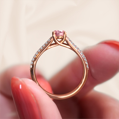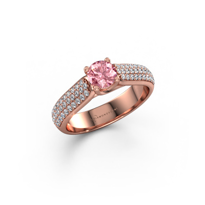 The ring shown above is called the Leoness. We call this type of ring a pavé solitaire ring. The centre gemstone is surrounded by smaller sized stones. This 14 Carat rose gold version is set with a 5 mm round pink lab grown diamond centre stone, embraced by smaller diamonds. What makes this classic rose gold pavé solitaire ring special is the setting of the smaller gems surrounding the centre pink lab grown diamond, which are shaped like a beautiful flower. The surrounding pavé solitaire of stones frame the middle centre stone in such a way to make it appear bigger. This type of engagement ring is also called a flower ring. It is very important that the smaller diamonds are positioned identically so there is no interference of light but perfect unity instead. Our skilled Goldsmiths get the job done. Each individual stone is carefully set by hand. During manufacturing, light fall is constantly monitored to make sure the special pavé solitaire effect is still visible. In the end you get the perfect engagement ring with a radiant pink lab grown diamond gemstone centrepiece. You can imagine the effect of a ring of such significance when you give tot the love of your life on her special day to shine. This jewel is unique in every way! Simply customize to your liking,By using our modern techniques, we can design and customize the finest quality jewels with the utmost care for you. Our engagement rings are always priced 30 percent lower than other jewellers. We make engagement rings to order so we don't have to maintain a large stock. If you have a certain budget, we are more than happy to advice you accordingly.Have you found a specific engagement ring somewhere which you would like to give to your loved one? Please feel free to express your wishes to our jewel designers because we would be honoured to turn your design into a classic engagement ring. You can follow the development of your ring design because we use 3D drawings. This gives you a realistic preview of how your design will look. You can also preorder a dummy. A dummy is a plastic ring, which can be shaped according your ring design. You can try it on and check if its width and size are suitable for you. We will gladly send you a non-binding offer, based on a fair price/ quality ratio. It will amaze you, considering the quality of the ring and gemstones.To make it easier for you, we offer a 30 day return policy. Check our terms and conditions.